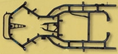 Dieser Rahmen ist nun zur Aufnahme eines Motor's hinter dem Fahrersitz lang genug. Durch seine hohe Stabilität auf der rechten Seite eignet er sich bereits zur Aufnahme eines schweren Motors. Allerdings sind die beiden parallel laufenden Rohre als Basis für einen schweren Motor zu eng zusammen. Aus diesem Grund haben einige Selberbauer das rechte äußere Rahmenrohr weiter nach rechts verlagert. Mit den dann notwendigen Verstrebungen sieht ein solcher Rahmen dann so aus wie in dem Bild unten. |