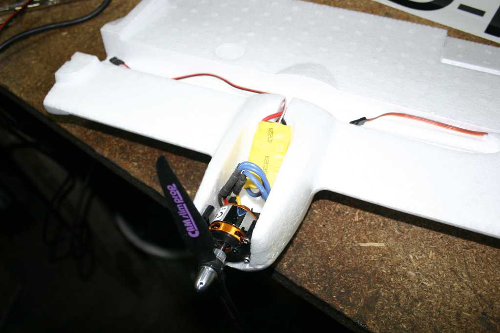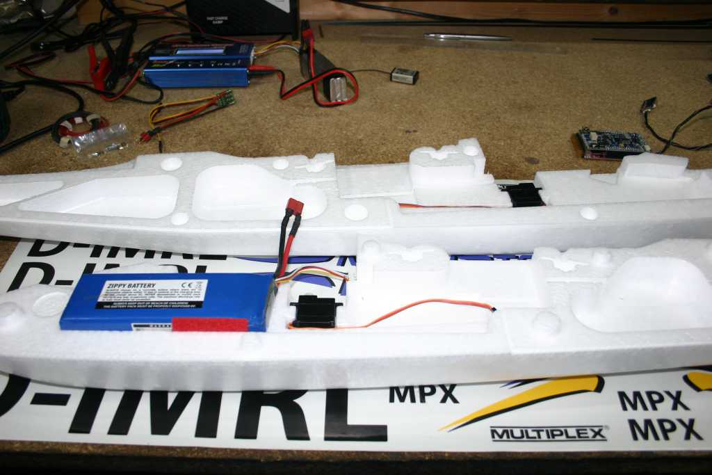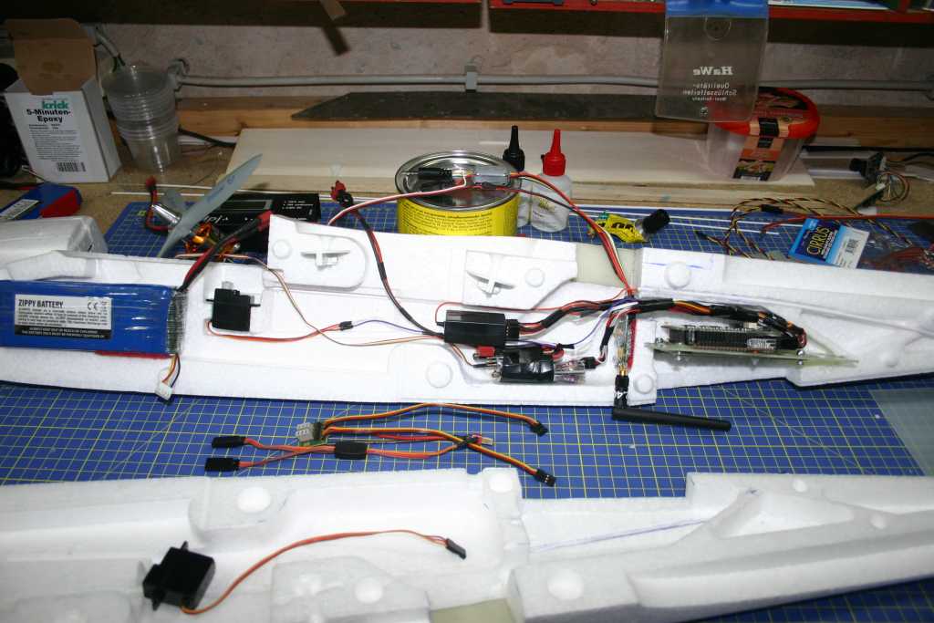 Aufnahme starten und onboard Kamera Aufnahme starten. Vollgas und Handstart. Ursache: Abhilfe: Die BEC in den Motorreglern in den Motorgondeln werden vom Stromkreis im Rumpf abgetrennt und versorgen ihrerseits lediglich das jeweils in der Fläche eingebaute Querruderservo. Ein Distanzstück für den Akku wird aus Styropor geschnitten um den Schwerpunkt weiter nach hinten zu verlegen. Risse aufgrund des Absturzes werden mit Uhu Por im Kontaktklebeverfahren geklebt, neuralgische Punkte werden mit Strappingtape verstärkt. |