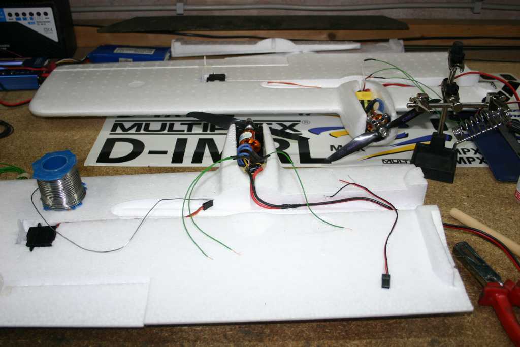 Es müssen die beiden Servokabel - ein mal Querruderservo und einmal für den Motorregler - sowie das Stromversorgungskabel für den Motorregler verlängert werden. Ich verwende hierzu keine Servoverlängerungskabel sondern verlängere die Leitungen selbst. Das hat den Vorteil, dass ich die Kabellängen so bemessen kann, dass möglichst wenig Kabelsalat entsteht. |