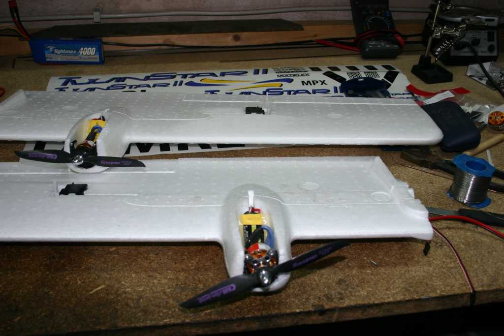 Als nächstes sollen die Motoren montiert werden. Normalerweise kommt der Twinstar mit 400er Permax Motoren. Diese Motoren sollen wieder durch bürstenlose Motoren ersetzt werden. Diese sind einfach wartungsfreundlicher und haben auch einen höheren Wirkungsgrad sowie eine höhere Leistungsabgabe. |