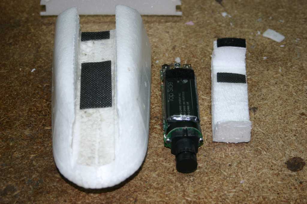 Damit das kein Gefummel gibt, wird der Laderaum hinter der Tragfläche auch von oben zugänglich gemacht. So kann man bequem den Videosender von oben durchstecken. An die Trennwand zum "APM Raum" habe ich Klettband angeklebt. Damit wird der Sender im Rumpf fixiert. Die Beladeöffnung nach oben verstärke ich mit GFK Platten. Wenn der Rumpf zusammen geklebt ist, kommen noch zwei Platten zur Verstärkung an die Stirnseiten der Beladeöffnung. |