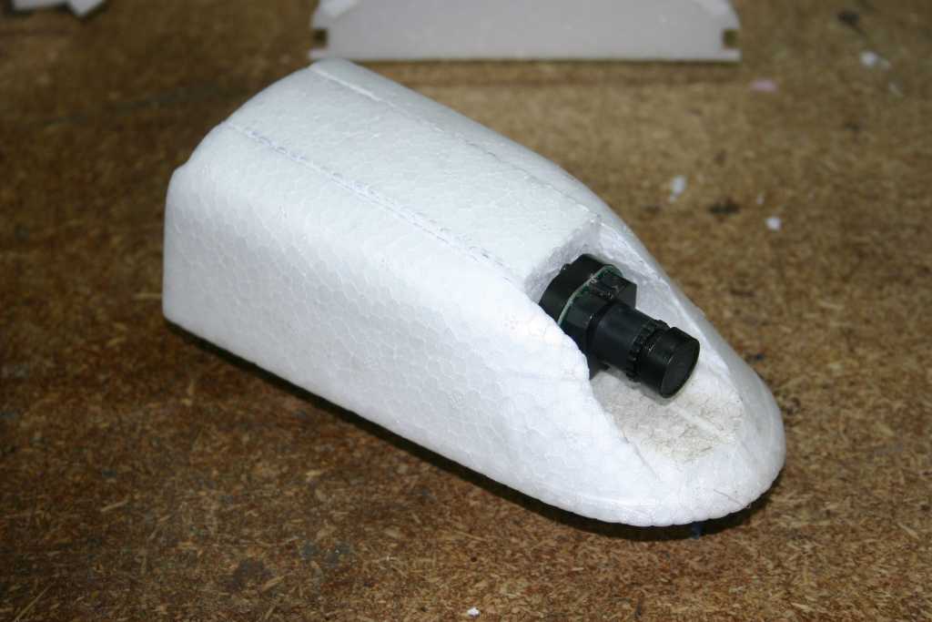Als Kamera will ich zunächst einmal die Fatshark HD Kamera nutzen. Sie zeichnet auf eine SDHC Karte auf und liefert ein PAL Video mit Ton. Weil ich momentan noch keinen Headtracker und auch noch keine Fernsteuerung mit genügend Kanälen für den Flieger (4 Kanäle) + OSD (2 Kanäle) + Pan/Tilt (2 Kanäle) habe, baue ich die Kamera erst mal starr in den Flieger ein. Ich schneide dazu das Originale Canopy so zurecht, dass die Kamera darin Platz findet. |