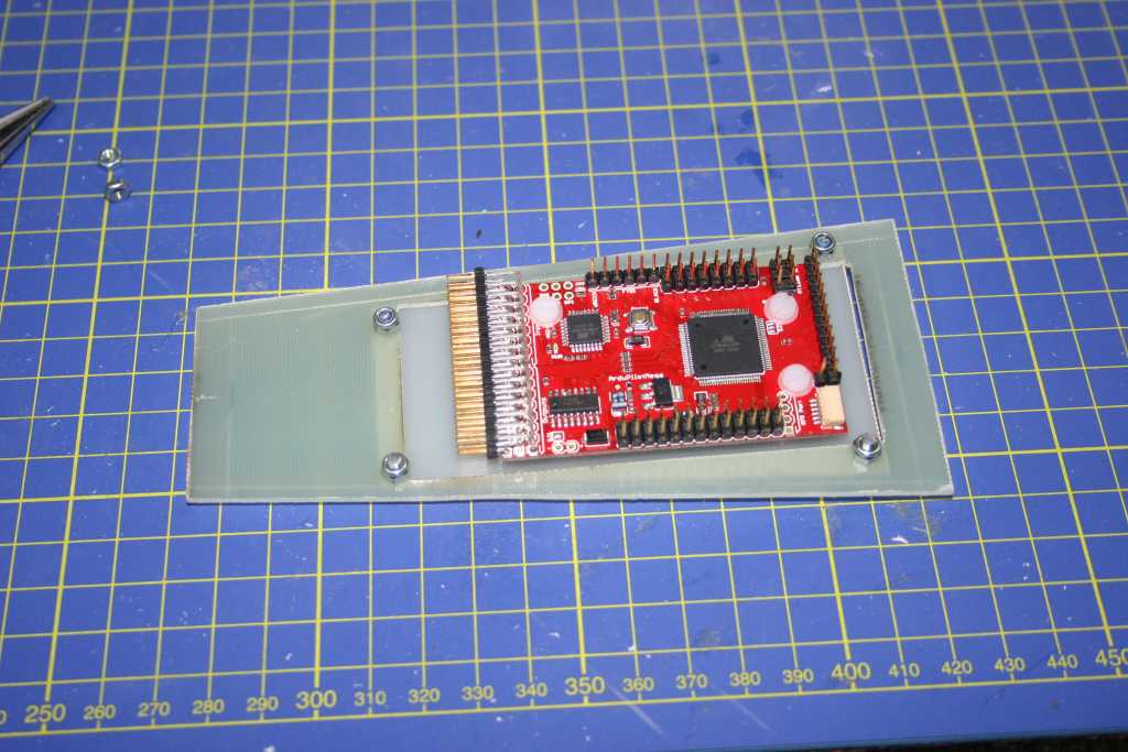 Als Autopilot soll nicht der kleine ArduPilot verwendet werden, sondern der ArduPilot Mega (APM) mit Oilpan IMU Shield. Damit der APM sicher im Rumpf befestigt werden kann und trotzdem relativ einfach zu entnehmen ist, wird ein Einbaurahmen und eine Trägerplatte aus GFK geschnitten und gebohrt. |