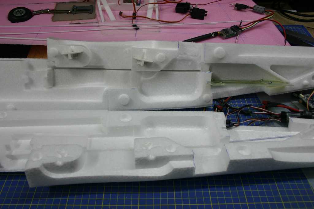 Jede Menge Laderaum wird gebraucht. Der Sender und das OSD muss auch noch untergebracht werden. Diese beiden will ich in den Hohlraum vor dem APM unterbringen. Dazu wird der Rumpf weiter aufgeschnitten. Gleichzeitig entsteht noch eine Kabeldurchführung für den "Kabelbaum" zum APM. Hier müssen immerhin 9 !!! Servokabel durch. Je 4 Leitungen für Gas, Höhe, Seite und Quer Eingang und Ausgang sowie eine Leitung für die Modeumschaltung des Autopiloten. |