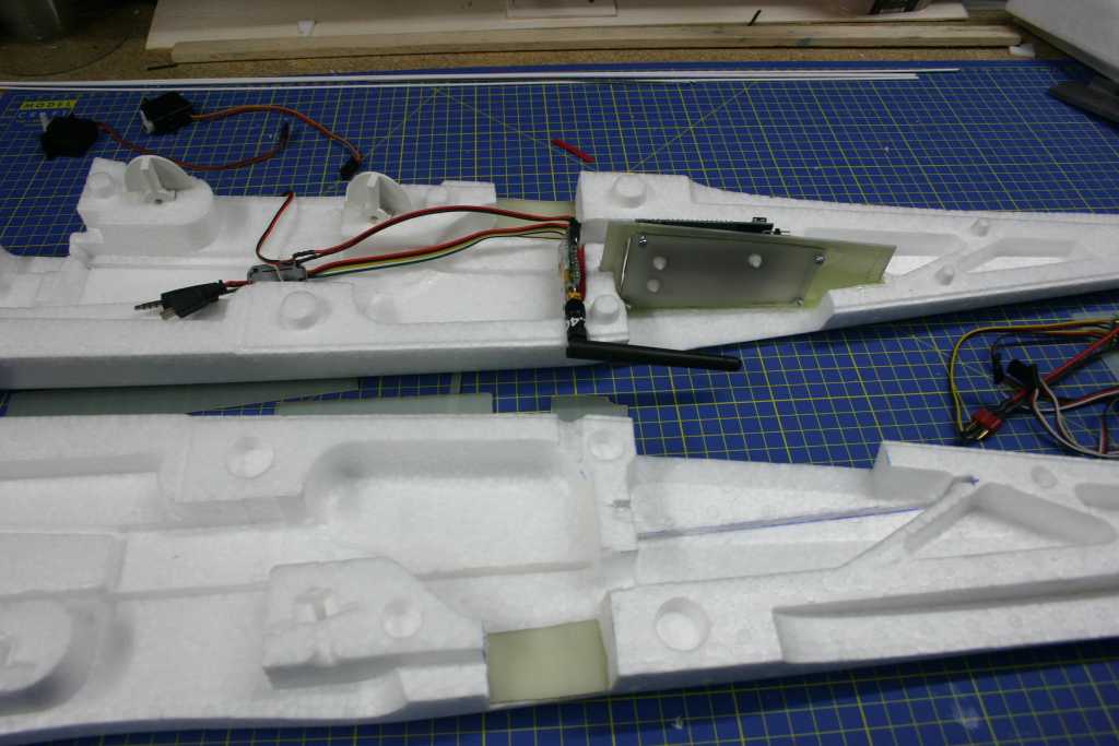 Die Modifikationen am Rumpf müssen an der anderen Rumpfhälfte ebenfalls durchgeführt werden. Nach einer Probe durch zusammenstecken der Rumpfhälften wird der Einbaurahmen in eine der Rumpfhälften eingeklebt. Sender und OSD mit Stromsensor will ich in den Hohlraum davor einbauen. Sender mit Antenne senkrecht nach unten. Sie wird bei der Landung im Gelenk nach hinten abknicken. |