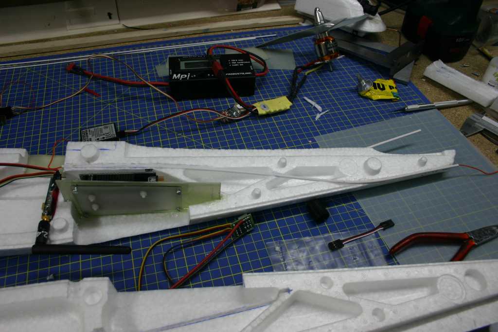 Nachdem nun die Bodenstation so gut wie fertig ist und mit FPV am Boden einige Erfahrungen mit den Scorpion gesammelt habe, ist es an der Zeit FPV dort zu betreiben, wo keine Balken sind - und man sich keinen Schwimmer schrotten kann ;-) Um die Komponenten sauber einbauen zu können, wird ein neuer Twinstar bestellt. Diesen will ich nicht nur als FPV Flieger benutzen, sondern auch als Versuchsträger für den Ardupilot. Selbiger muss sorgfältig - parallel zur Flugebene eingebaut werden, das geht besser, wenn die Rumpfhälften noch nicht zusammengeklebt sind. |
