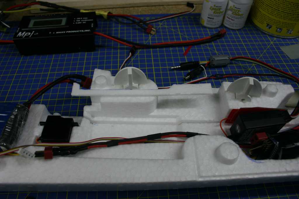 Diese Kabel werden ebenfalls angeschlossen und verlegt. Das Seitenruderservo wird montiert. Im alten Twinstar haben diese Servos "Zahnausfall" und sollten bald ersetzt werden bzw. ein neues Getriebe erhalten. Es ist also durchaus möglich, dass so etwas mit diesen Servos auch passieren kann. Daher befestige ich dieses Servo ebenfalls nur mit selbstklebendem Klettband. Aber das ist dann doch etwas zu wackelig weil die Ausschachtung für das Servo zu breit ist. Das ist aber mit einem Stückchen 2mm starkem Depron schnell behoben. |