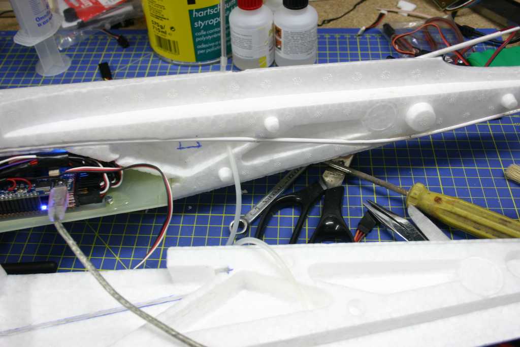 Die Leitungen werden nun sauber in der Aussparung der Tragfläche verlegt. Wo die Aussparung nicht tief genug ist, wird sie mit dem Lötkolben passend gemacht. Die Leitungen werden dann mit einigen Tropfen Sekundenkleber fixiert. |