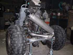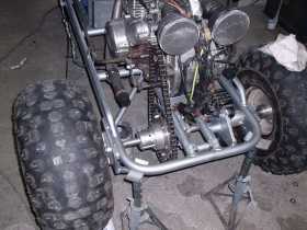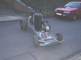 Carsten hat sich bei uns zum Dreher und Fräser entwickelt. Der hat die ganzen Aufnahmen z.B. für die Bremse gemacht. Ich habe den Rahmen und alles was zu schweißen war erledigt. Claas hat sich den ganzen Fummelkram zur Brust genommen wie z.B. Pedale anbauen, Elektrik und Seilzüge verlegen. Am 25.09. hat der Motor mit der Hinterachse schon einmal Verbindung aufgenommen. Den Sitz habe ich aus Stahlrohr selbst gebogen weil uns ein gebrauchter Kartsitz einfach viel zu teuer war. Den Sitz kann man noch 10 cm vor oder zurück bewegen. Dann mußten wir eine Pause von ca. 3 Wochen einlegen. |