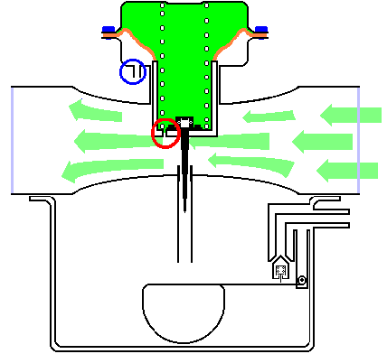 Das wichtigste Bauteil jedes Vergasers ist das Venturirohr. Das ist das Rohr durch das die Luft vom Luftfilter in Richtung Einlass strömt. Das Venturirohr ist in der Mitte nach innen gewölbt wie eine Flugzeugtragfläche. Wenn Luft durch das Rohr strömt und den engeren Bereich passiert, muß sie an dieser Stelle schneller strömen als in den anderen Bereichen. Dadurch entsteht an der Engstelle ein Unterdruck (wie an der Oberseite einer Tragfläche). |