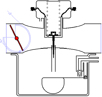 Dadurch wird bei zu magerem Gemisch - also bei zu hoher Drehzahl die Düsennadel herausgezogen und dadurch das Gemisch fetter. Die Drehzahl sinkt bis der Motor mit dem optimalem Gemisch läuft Der Vergaser funktioniert jetzt schon ganz gut, nur leider gibt es jetzt keine Möglichkeit mehr ihn zu regulieren da alles vom Luftstrom abhängt den der Motor ansaugt. Um die Drehzahl des Motors zu regulieren braucht man nun eine Drosselklappe. Die Drosselklappe(rot) reguliert bei Bedarf den Luftstrom im Venturirohr. Bei geschlossener Drosselklappe entsteht nun aber im Venturirohr kein Unterdruck mehr da die engste Stelle nun an der Drosselklappe ist. Durch das Röhrchen würde kein Kraftstoff mehr angesaugt werden und der Motor würde aus gehen. |