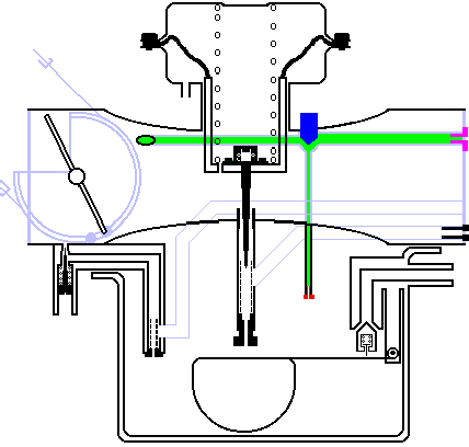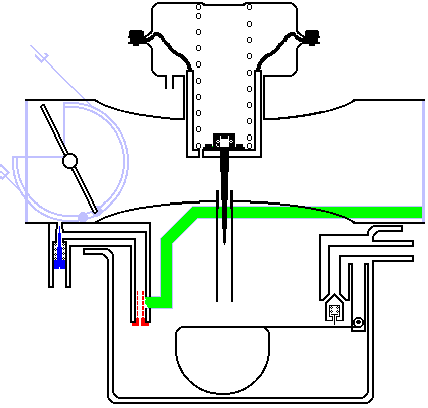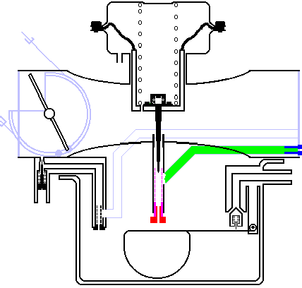 Ein zusätzliches Ansaugsystem in der Nähe der Drosselklappe für das Standgas wird benötigt. Das Benzin wird über die Leerlaufdüse (rot) angesaugt und dabei grob vordosiert. Danach gelangt es an der Gemischregulierschraube (blau) in das Venturirohr. Damit der Benzinnebel schön fein ist wird das Benzin an der Leerlaufdüse mit Hilfe zusätzlicher Luft die durch den Leerlaufluftkanal (grün) zugeführt wird vorgemischt. |